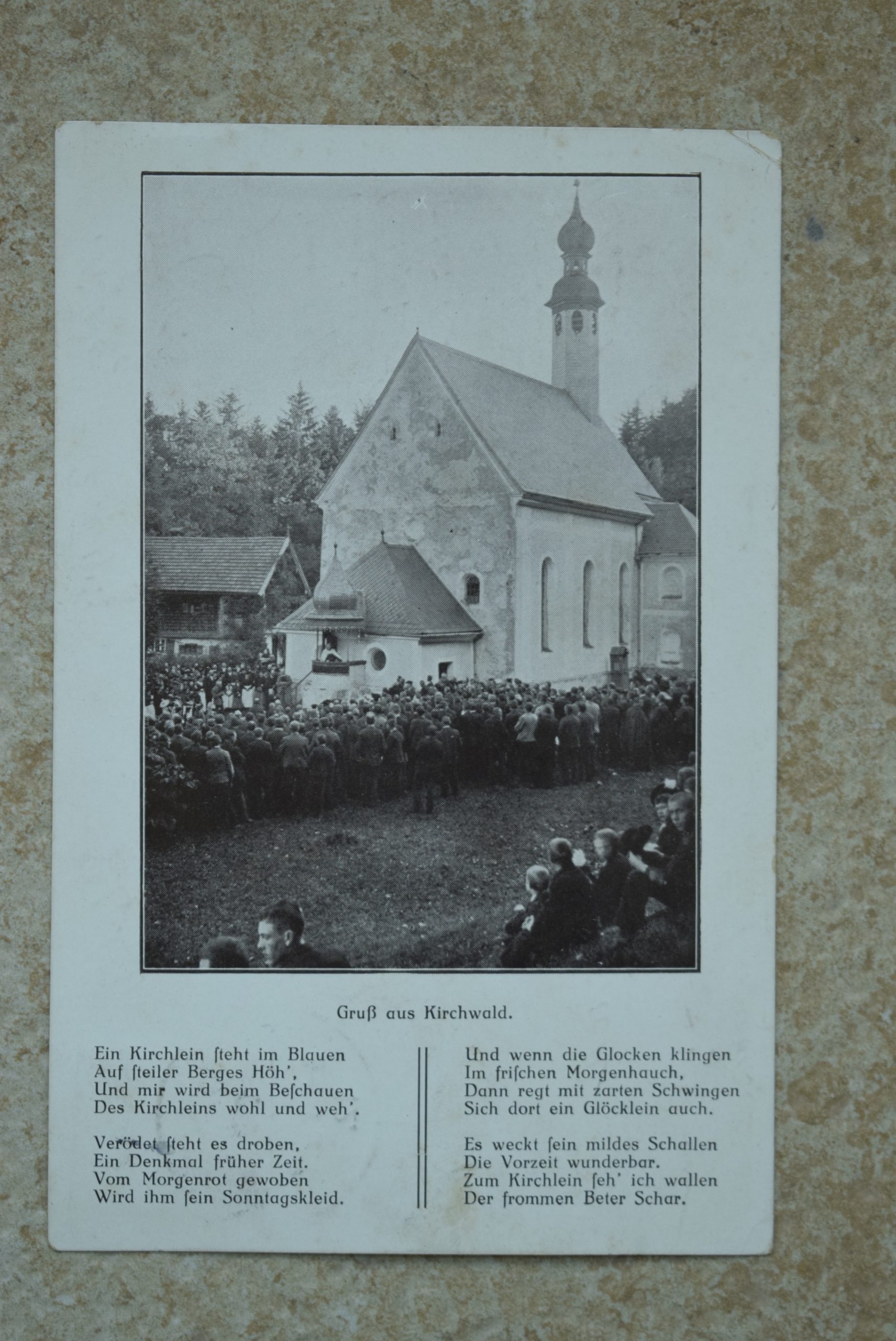 An der südlichen Außenwand der Kirche steht ein mobiler Beichtstuhl. Goldener Samstag in Kirchwald, Postkarte, gelaufen 1912 (Gemeindearchiv Nußdorf)