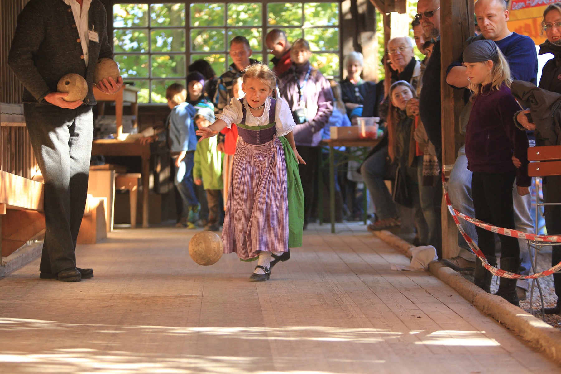 Beim Kegeln können große und kleine Besuchende ihr Geschick unter Beweis stellen. Bildquelle: Bezirk Oberbayern, Archiv FLM Glentleiten, Foto: Kolb.