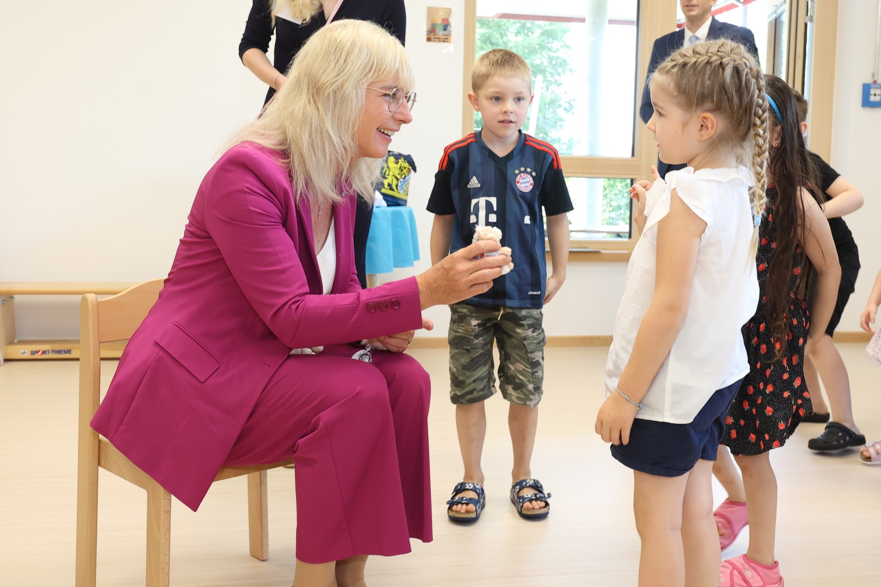 Familienministerin Ulrike Scharf mit Kindern vom städtischen Kinderhaus „Sonnenhügel“ in Dorfen.