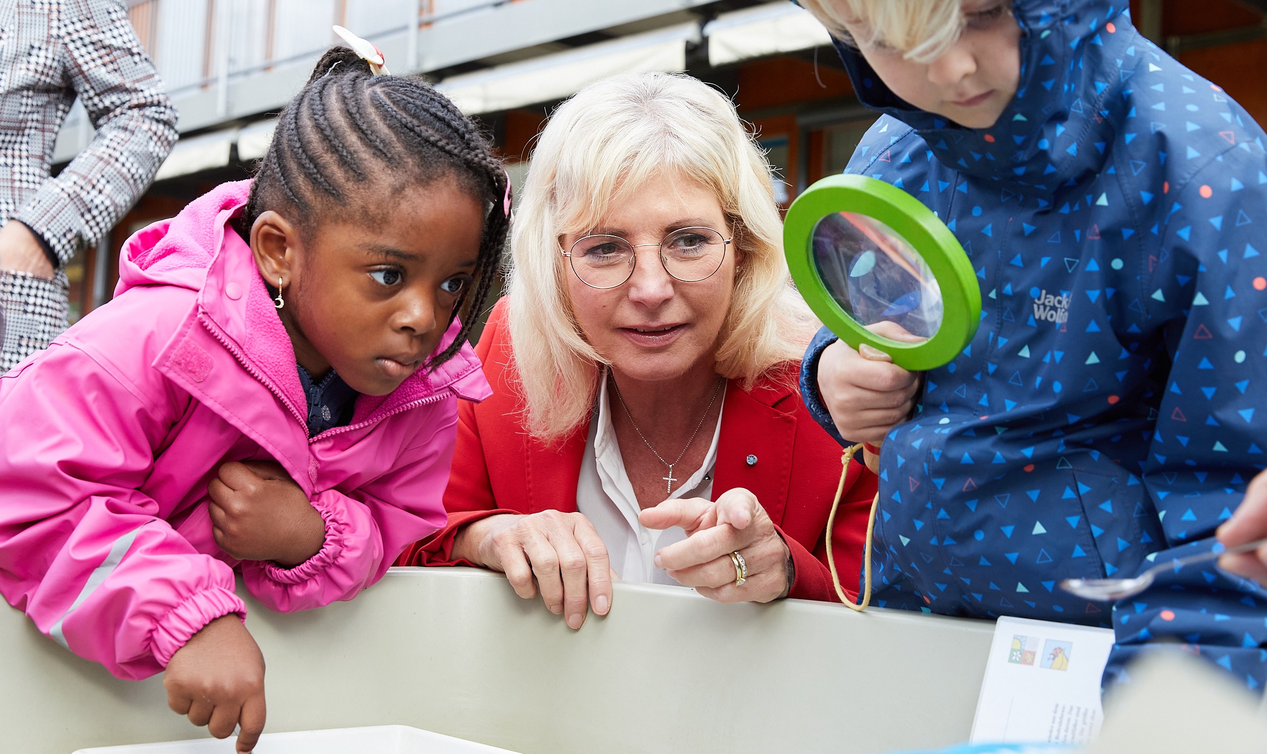 Familienministerin Ulrike Scharf mit zwei Kita-Kindern bei einem Experiment zum Thema „Böden“ Fotoquelle: StMAS