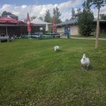 Wir radeln bis Happing, schaun kurz in die Kirche hinein und fahren dann auf der nur wenig befahrenen schmalen Autostraße nach Norden bis wir zu einer Kreuzung kommen. Links geht es zu einem Golfplatz, rechts zur Koko Beach. Es gibt mehrere große Parkplätze, die heute fast leer sind. Am Wochenende bei schönem Wetter muss hier ganz schön was los sein. Wir fahren rechts und kommen nach Durchqueren eines weitläufigen Geländes mit Sportanlagen, Bänken und Grillplätzen an den Happinger Au See, fast genauso idyllisch wie der Happinger See. Unweit vom Ufer befindet sich ein Pavillon, an dem es Getränke und kleine Speisen gibt. Auch hier ist noch nichts los, nur eine Schwimmerin steigt gerade aus dem Wasser und zwei Schwäne gehen Schwimmen.