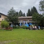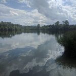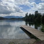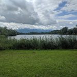 Also die Räder ins Auto gepackt und nichts wie hin. Wir wollen das Gebiet gleich am Stadtrand von Rosenheim zwischen der Eisenbahnlinie Rosenheim-Kufstein und dem Inn mit dem Fahrrad erkunden und starten beim Seewirt am Happinger See, weil wir hier zum Schluss im Biergarten einkehren wollen. Es ist ein Wochentag und in der Nacht hat es geregnet, daher sind nur wenig Leute da. Zwei junge Frauen schwimmen im See, eine Familie mit Kindern sitzt im Biergarten. Der See ist wirklich idyllisch, eine kleine Perle mit Bilderbuchausblick ins Gebirge.