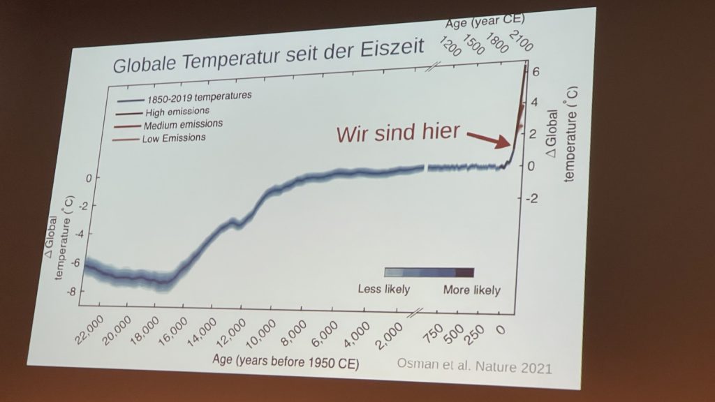 Professor Harald Lesch und Professor Christian Holler, ein geborener Rimstinger, hielten im vollbesetzten König Ludwig Saal in Prien einen Vortrag über die Entwicklung unserer von Menschen gemachten Klimaveränderung. Dabei räumten sie mit dem gängigen Argument der Klimaleugner, „Klimaveränderungen hat es immer schon gegeben“, schon zu Anfang auf, indem sie an Schautafeln die Geschwindigkeit der Erwärmung seit dem Ende der Eiszeit und den extrem hohen Anstieg ab Beginn des Industriezeitalters ab 1850 darstellten. Nicht nur wir Menschen, sondern die gesamte Evolution kann sich bei dieser Geschwindigkeit nicht schnell genug umstellen, weshalb derzeit so viele Tiere und Pflanzen aussterben.