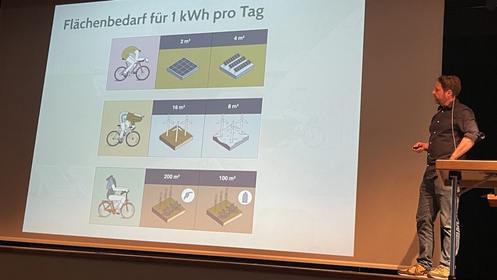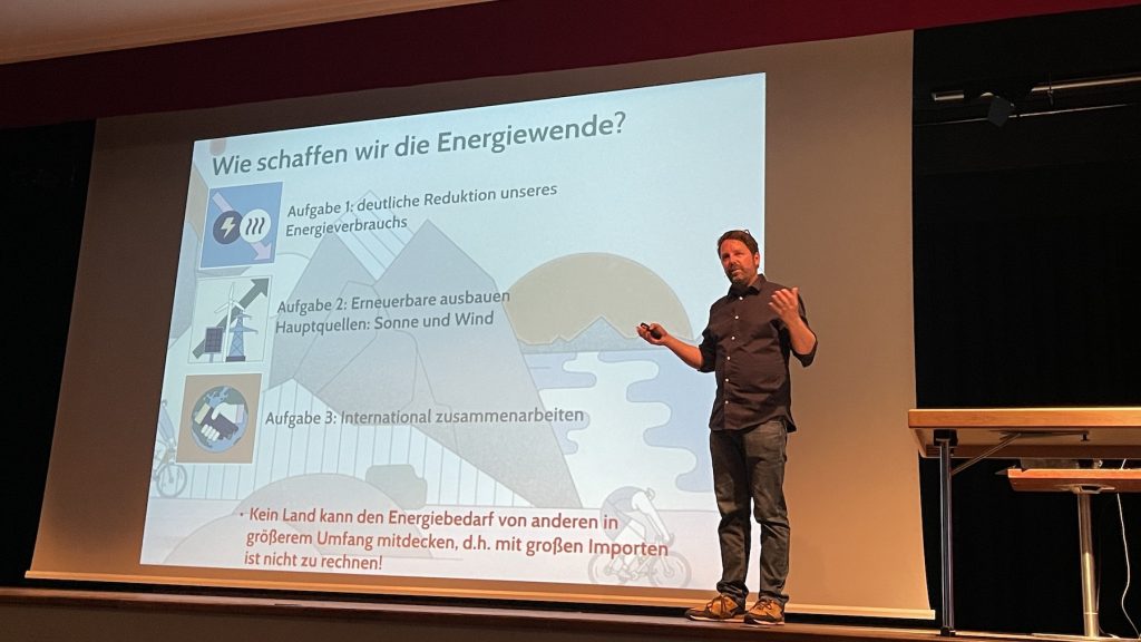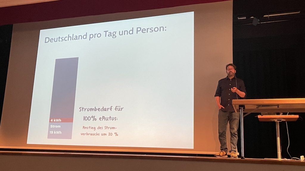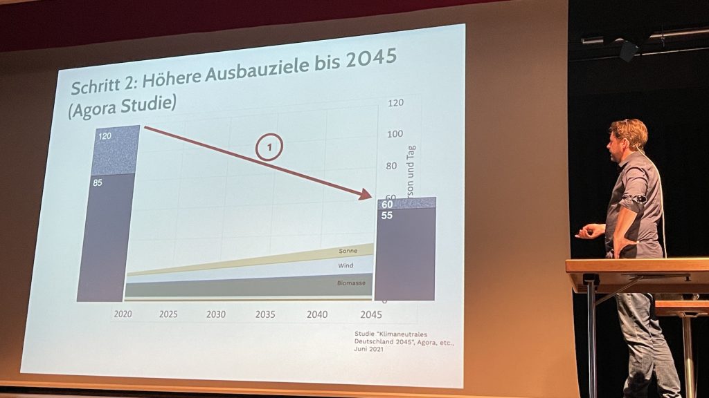Wenn wir bis 2045 unsere gesamte Energie alternativ erzeugen wollen, dann müssen wir sieben Mal so viel Fotovoltaik gegenüber heute und 2000 Windräder pro Jahr bauen. Das ist machbar! – aber nur, wenn wir die Hälfte unserer Energie einsparen, war die Aussage zum Schluss der Veranstaltung.