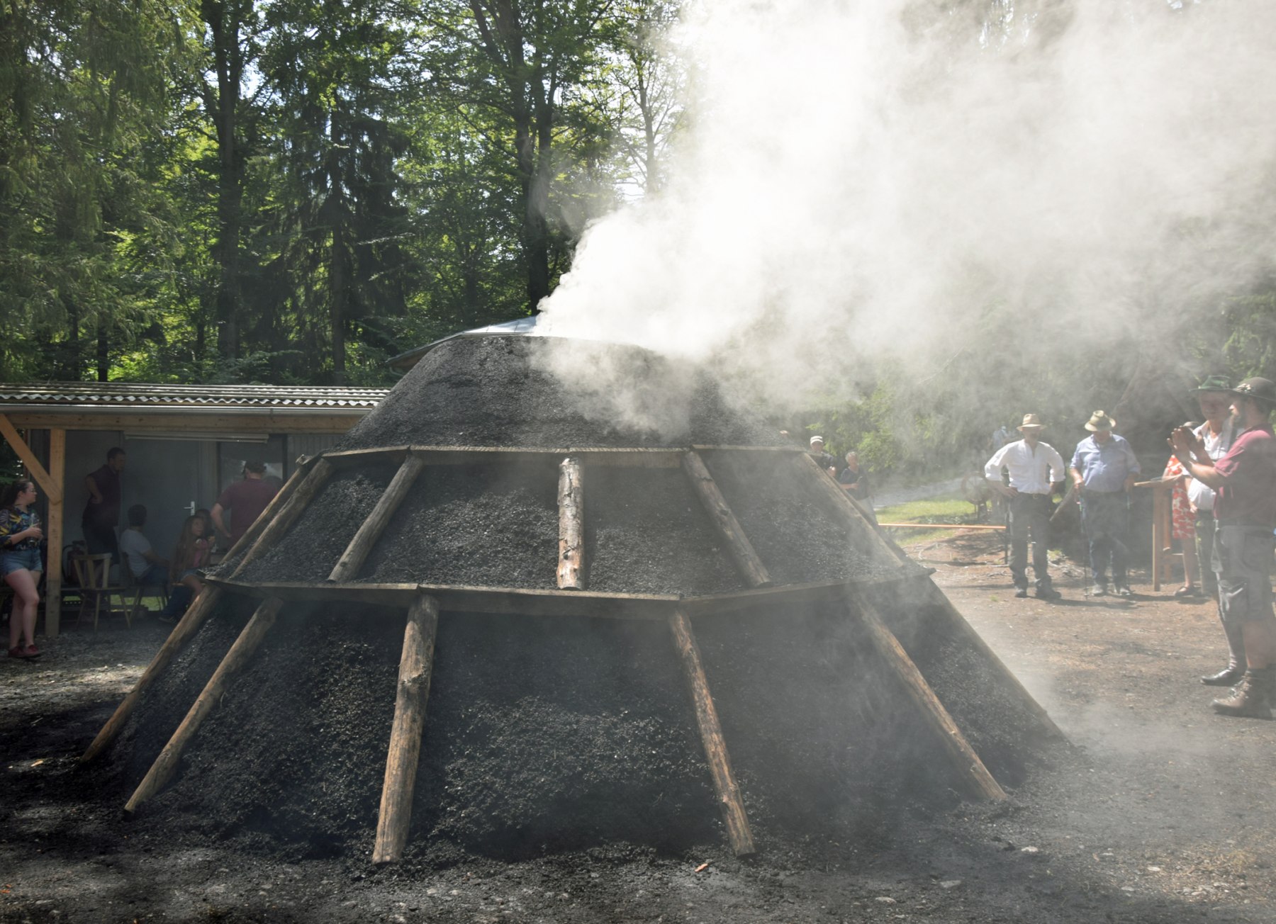 Bald qualmt der Kohlenmeiler wieder und verbreitet an der Glentleiten seinen unverwechselbaren Duft. Bildquelle: Bezirk Oberbayern, Archiv FLM Glentleiten.