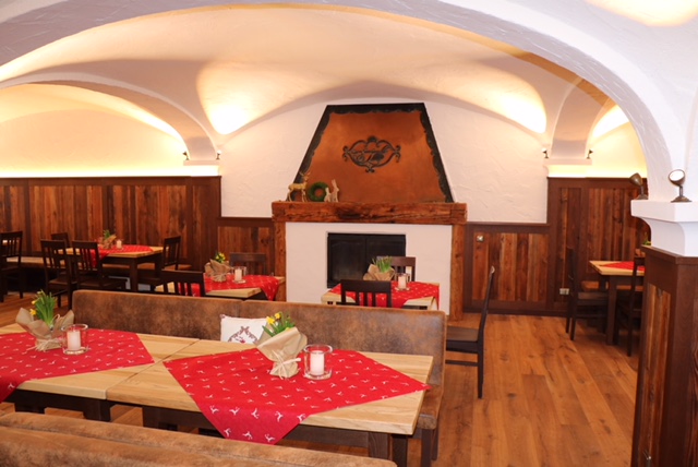 Blick in den neu gestalteten großen Gastraum; ein neuer Boden, Tische, Bänke und Stühle aus altem Holz lassen den großen Gastraum im neuen Glanz erstrahlen.