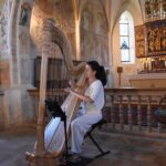 Silke Aichhorn erzählte den Zuhörern, dass es für sie ein großes Privileg ist, an diesem besonderen Ort auf ihrer Harfe zu spielen. Ein kleiner humorvoller Exkurs zu dem Instrument folgte. So ist es nicht so einfach mit einem der größten und schwersten Instrumente den Berg hinauf zu kommen. 40 Kilogramm wollen bewegt werden. Jedes Kilogramm kostet eintausend Euro, kommt aus Amerika und hält nur sechs bis acht Jahre. Die Harfe muss mit Händen und Füßen bedient werden, die Spielerin muss also multitaskingfähig sein, darum sind es meist Frauen, die das Instrument spielen, erzählt die Künstlerin augenzwinkernd.