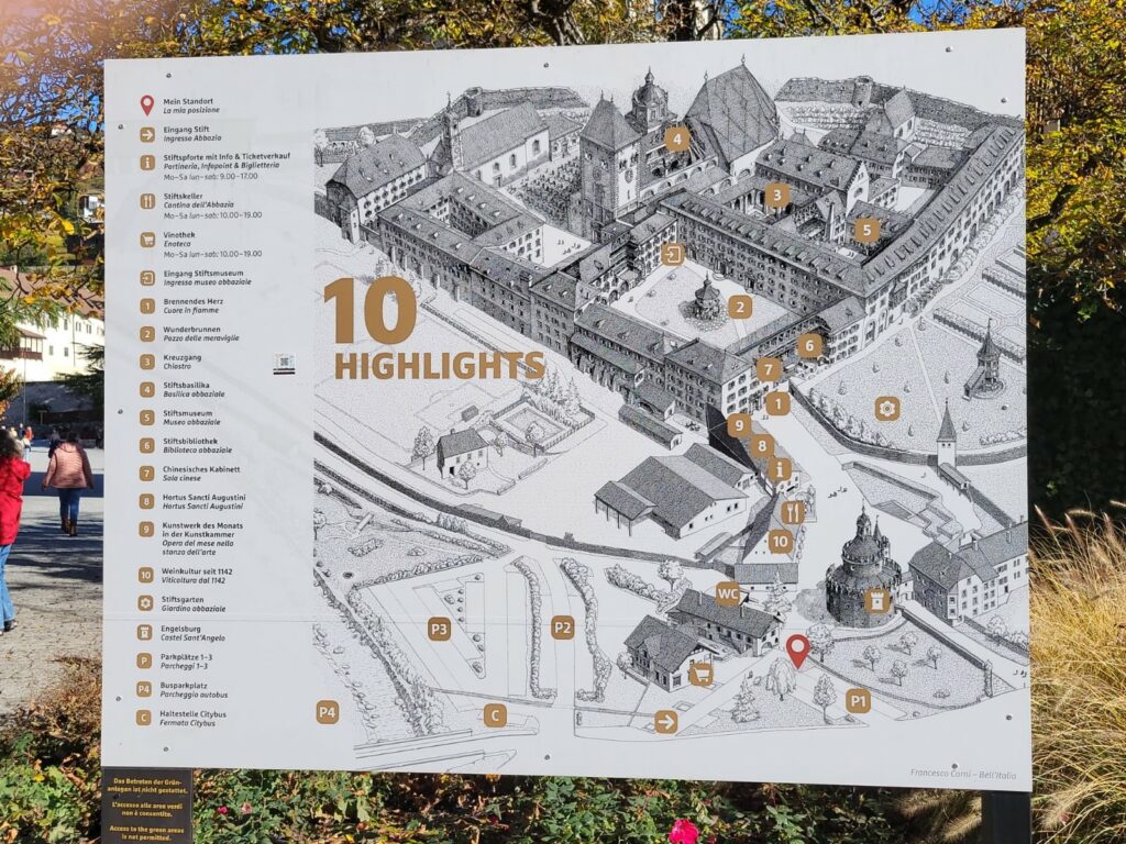 Nach einem etwas holprigen Start am frühen Morgen erreichte die Reisegruppe bei strahlendem Herbstwetter das Augustiner-Chorherren-Stift Neustift bei Brixen. Das weitläufige Kloster mit seinen Weingärten, Wäldern und Bildungsstätten beeindruckte durch seine gepflegte Anlage und die lebendige Verbindung von Tradition und Gegenwart. Eine ausführliche Führung eröffnete Einblicke in das klösterliche Leben, die Geschichte der Gemeinschaft und nicht zuletzt in die prachtvolle Bibliothek – ein Ort stiller Gelehrsamkeit, der alle tief beeindruckte. Nach einer stärkenden Einkehr im stiftseigenen Klosterstüberl ging es weiter durch die kurvigen Straßen über Barbian hinauf auf den Ritten.