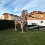 Bei den Tieren handelt es sich um Kunstwerke vom Lokschuppen Rosenheim. Schülerinnen und Schüler der Klasse 8 a Mittelschule Fürstätt hatten mit Holzbildhauer Franz Jäger auf dem Vorplatz die Mammuts aus Holz gebaut – als Blickfang für die Ausstellung EISZEIT. Nachdem im März die neue Ausstellung VULKANE ansteht, mussten die Mammuts weg. Auf Facebook und Instagram bot der Lokschuppen die Tiere kostenlos an, bezahlt werden musste nur der Transport. Die Erste, die sofort zuschlug, war Nina Giglberger. „Ich habe das gelesen und zu meinem Mann gesagt: Sowas möchte ich! Wir haben noch kein Haustier, und ein hölzernes Mammut wäre doch toll, und es macht unseren Garten schöner.“ Gemeinsam mit Ehemann Andi und den Freunden Stefan und Harry holten sie das mittelgroße Mammut, das nur unter größten Mühen auf einen Anhänger gehievt wurde. Mit ihren beiden Söhnen Henri und Pepe musste jetzt nur noch der passende Name gesucht werden. Am Ende wurde es „Bodo“.