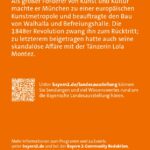 Und jetzt kommt noch eine Frau ins Spiel: Lola Montez. Der Ruf des Königs ist dahin. Karikaturen und Spottfiguren sind beinahe allgegenwärtig. Um einen Aufstand zu verhindern, muss Ludwig seine Lola aufgeben. Die Lage beruhigt sich nur scheinbar. Die Rufe nach Pressefreiheit und Mitbestimmung verstummen nicht. Auch wenn nur wenige ein Ende der Monarchie fordern, Ludwigs Selbstverständnis ist ein anderes. Der König tritt am 20. März 1848 zurück. Obwohl Ludwig I. noch fast 20 Jahre lebt und seine Bauprojekte zu Ende geführt werden, politischen Einfluss kann er nicht mehr geltend machen.