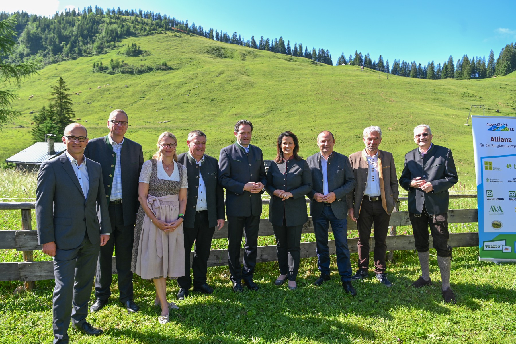 Ministerin Michaela Kaniber (4.v.l.) mit dem österreichischen Bundesagrarminister Norbert Totschnig (5v.l.) mit den Podiumsteilnehmern des Alpen.Gipfel.Europa 2022 auf der Unteren Firstalm im Landkreis Miesbach.
