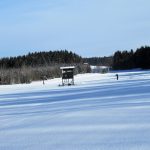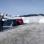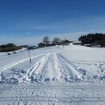 Der Einstieg in die schöne, durchwegs durch offenes Gelände und vorbei an kleinen Weilern führende Loipe erfolgt jetzt beim neuen Wanderparkplatz an der Elpertinger Straße in der Nähe vom Wastlhof, so dass ich mir nach dem Langlaufen auch gleich noch die guten Eier von dort holen kann. Das Wetter ist schön und der Parkplatz ist am Vormittag schon ganz gut belegt, aber es ist noch Platz. Man muss normal jetzt eine Parkgebühr bezahlen, aber das geht heute nicht, der Automat ist verhüllt. Auf einer Informationstafel kann ich mir den Verlauf der Loipe anschauen, der aber kaum vom früheren Verlauf abweicht.