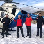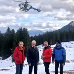 Gruppenfoto: v.l. Wolfgangs Spindler, Projektleiter, Innenminster Joachim Herrmann, Klaus Stöttner, MdL und Kuratoriumsvorsitzender, Helmut Weidel, Leiter der Alpinen Polizei und Sprecher des Projekts Lawinenleitfaden, (im Hintergrund der Hubschrauber mit dem ‘RECCO-SAR-Detektoren’)