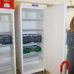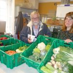 Fotos: Hötzelsperger – Susanne Blöchinger, Leiterin der Chiemseer Tafel vom Caritas-Zentrum Prien und Fritz Seipel, Verbindungsmann zur Gemeinde Prien vor den halb vollen bzw. fast leeren Lebensmittelkisten und Kühlschränken.