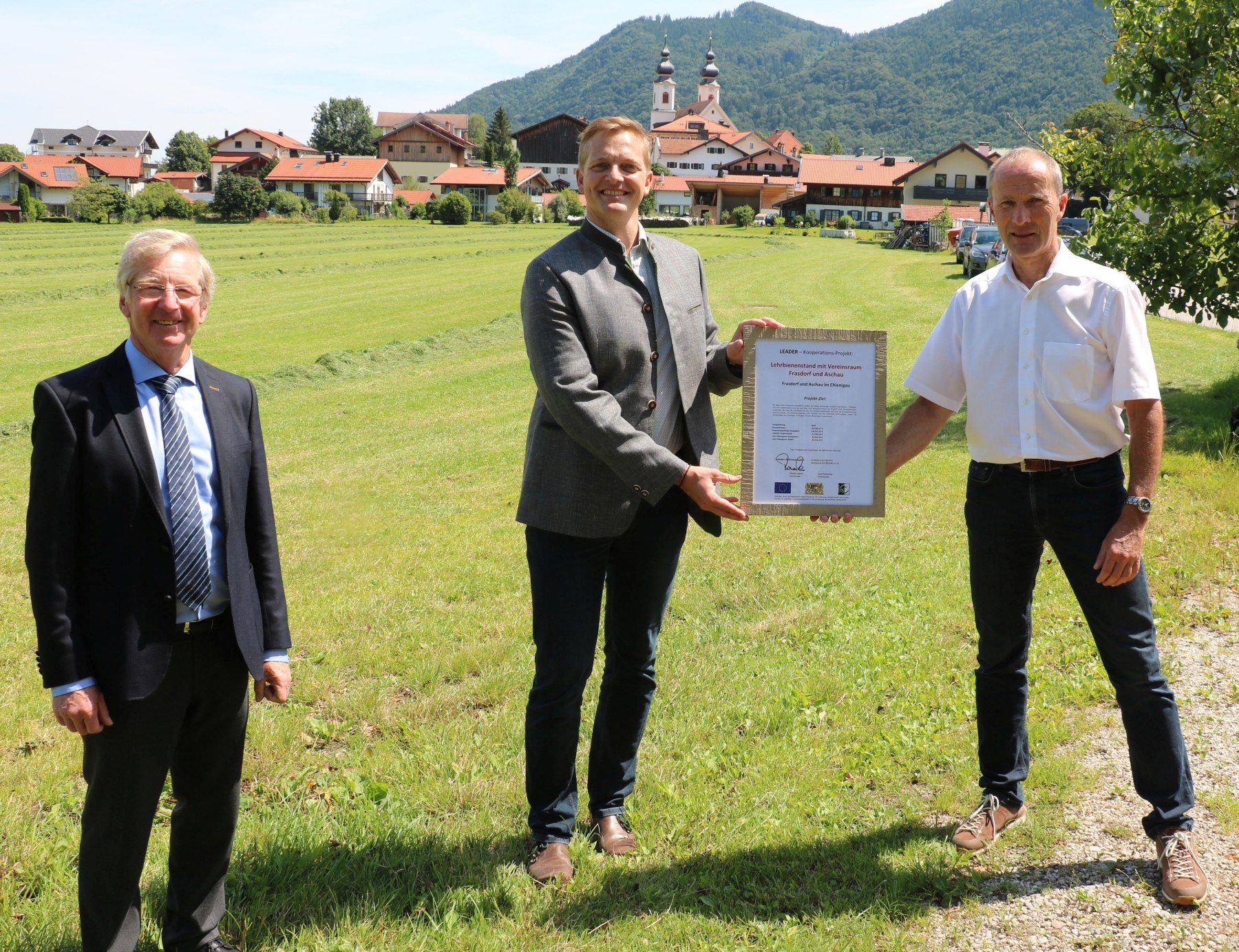 Förderzusage für den gemeinsamen Lehrbienenstand der Gemeinden Aschau und Frasdorf. Thomas Kamm (rechts) Vorsitzender der Lokalen Aktionsgruppe (LAG) Chiemgauer Alpen übergibt die Urkunde an Bürgermeister Simon Frank (Mitte); links im Bild LEADER-Koordinator Sebastian Wittmoser vom AELF Rosenheim. Er ist der zentrale Ansprechpartner für das Förderprogramm LEADER. Zusammen mit dem für Förderfragen zuständigen Fachzentrum Diversifizierung und Strukturentwicklung am AELF Rosenheim bietet er Beratung in allen Fragen zu LEADER.