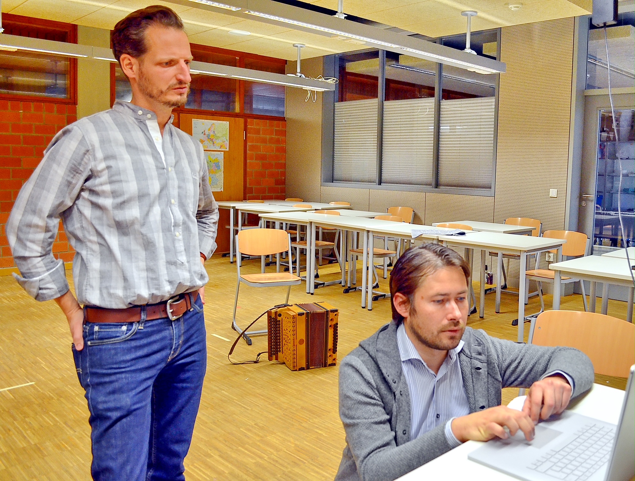 „Studio“ in der Landsberger Berufsschule: Magnus Kaindl und Johannes Sift richten sich ein für die Fortbildung, die quer durch alle Regierungsbezirke Bayerns in viele Schulen neue Tanzelemente hineinträgt.