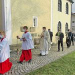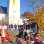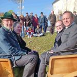 Ehe in Greimharting der Gottesdienst zum Kirchenpatrozinium beginnt ist es gute Tradition, dass fünf Verantwortliche des öffentlichen Lebens eine große Kerze in die Kirche tragen. Nachdem es diese Tradition schon lange vor der Gebietsreform im Jahr 1978 gab, werden die fünf Kerzen namentlich mit den Gemeinden Greimharting, Prien, Rimsting, Hittenkirchen und Wildenwart bezeichnet. Für diese Gemeinden waren heuer nach den Kommunalwahlen im letzten Jahr und nach dem Ausfall des Leonhardiritts im Vorjahr die Bürgermeister Andreas Fenzl (Rimsting), Andreas Friedrich (Prien) und Daniel Mair (Frasdorf) zusammen mit Gerhard Jell, der die ebenfalls neue Bürgermeisterin von Bernau Irene Biebl-Daiber vertrat, allesamt Gemeinde-Oberhäupter erstmals dabei – und allesamt waren sie angetan von der frommen Brauchtumspflege in Greimharting. Gemeinsam nahmen sie Platz auf der Ehrenkutsche von Sebastian Mayer, der auf dem Kutschbock von Bezirksrat und Bayernbund-Landesvorsitzenden Sebastian Friesinger begleitet wurde und der seinerseits als Verantwortlicher des nunmehr zu Ende gegangenen Rosenheimer Bauernherbstes resümierte: „Leonhardi beendet wieder die Bauernherbstsaison, in Greimharting wie immer in authentischer Weise, den stillen Kräften gilt mein Dank!“.