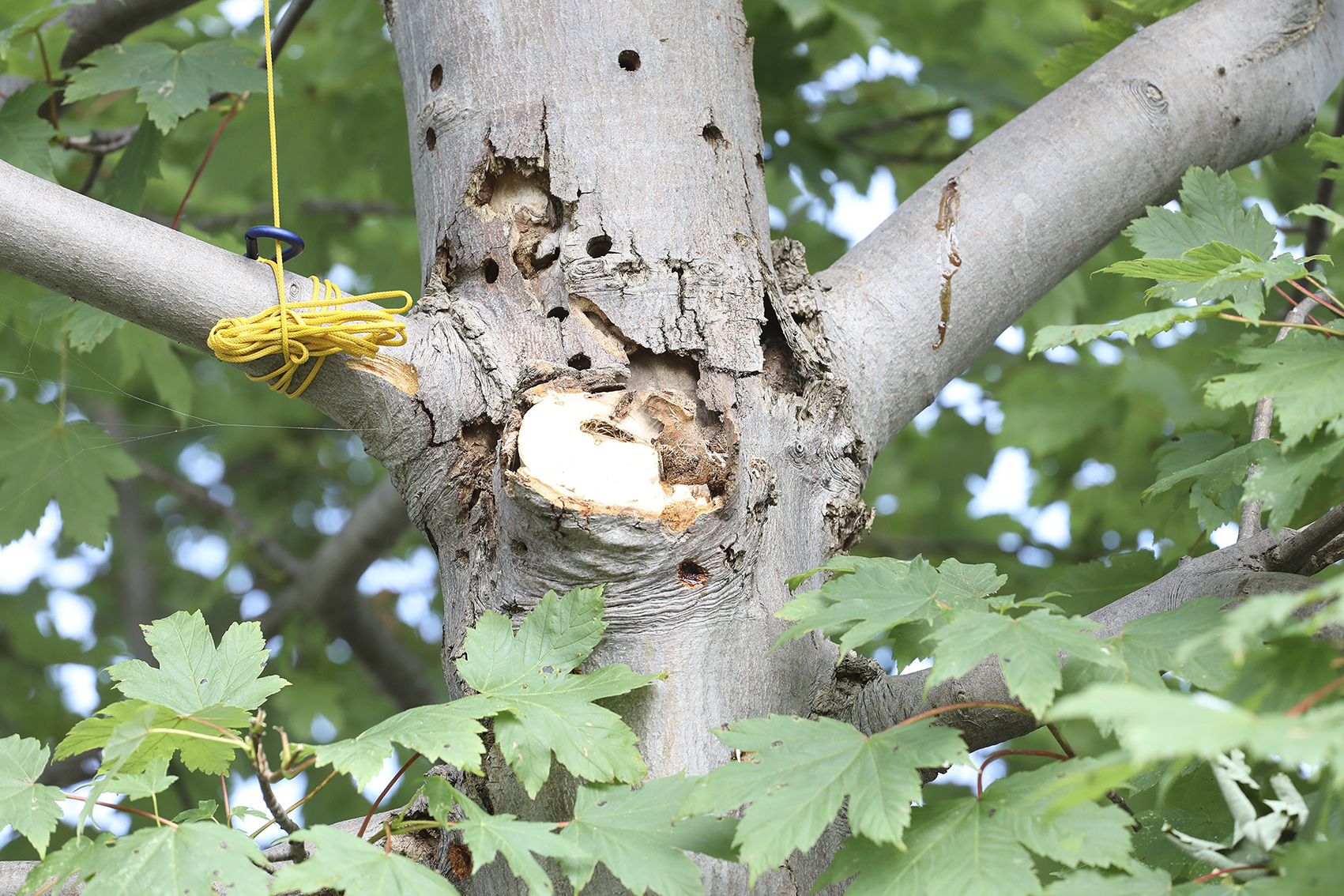 Der Baum zeigt einen klassischen ALB-Befall: Kreisrunde Ausbohrlöcher. (Foto: LfL)
