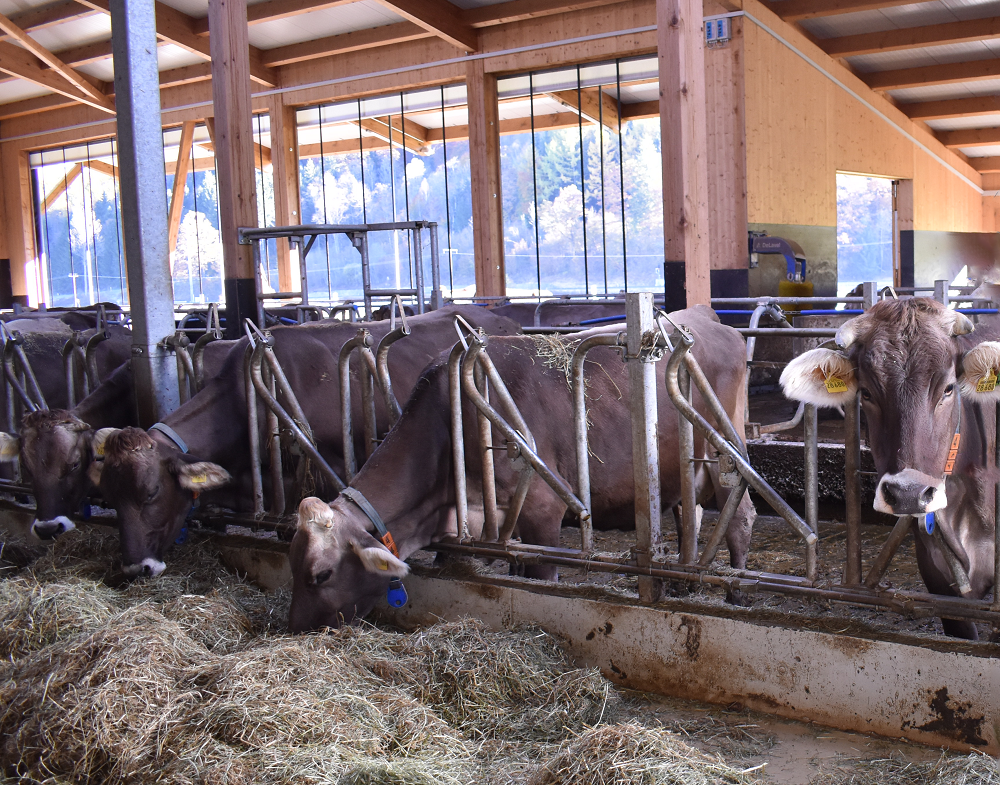 Mehrere Kühe stehen in einem Laufstall am Futtertisch. (Foto: LfL)