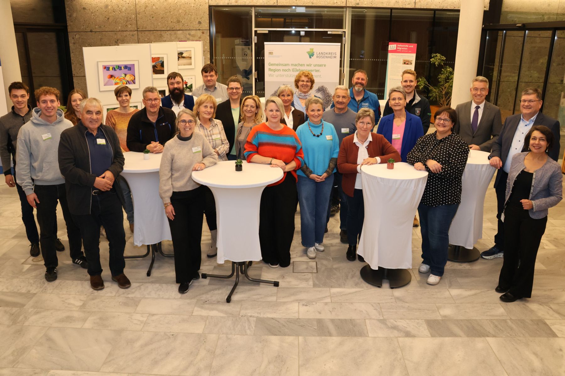 Ehrenamtskoordinatorin Giulia Giardina (rechts), Referent Karl Bosch (2.v. rechts) und Landrat Otto Lederer (3.v. rechts) freuten sich gemeinsam mit den Ehrenamtlichen über die erfolgreich abgeschlossene Fortbildung zum „Vereinsführerschein“. Foto: Landratsamt Rosenheim.