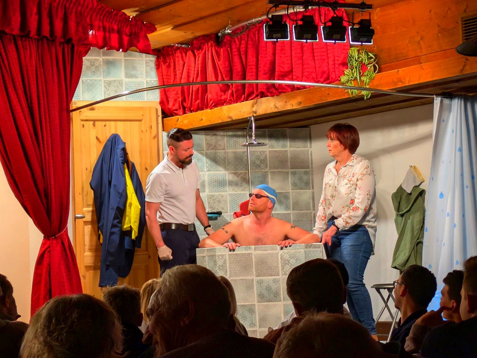 Peter Lanz (Mitte, gespielt von Franz Wörndl) blieb aufgrund eines Hexenschusses in der Badewanne stecken. Susi Stoib (Lisa Forstner) und Dr. Kommisari (Wolfgang Schuster) können nicht weiterhelfen.