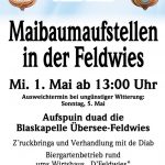 Der Feldwieser Maibaum wird dieses Jahr am Mittwoch, den 1. Mai, ab 13 Uhr beim Wirtshaus “D’Feldwies” von den Trachtlern aufgestellt. Ausweichtermin bei ungünstiger Witterung ist Sonntag, der 5. Mai. Die Blaskapelle Übersee-Feldwies umrahmt die Veranstaltung musikalisch.