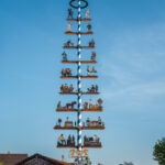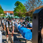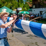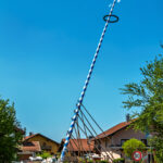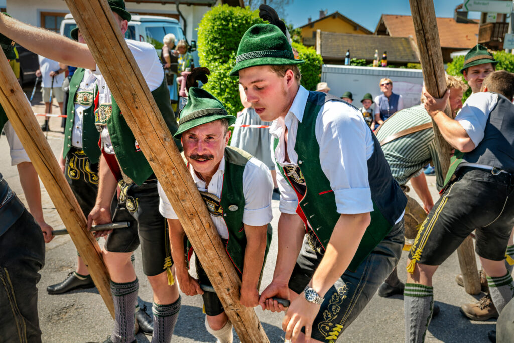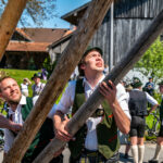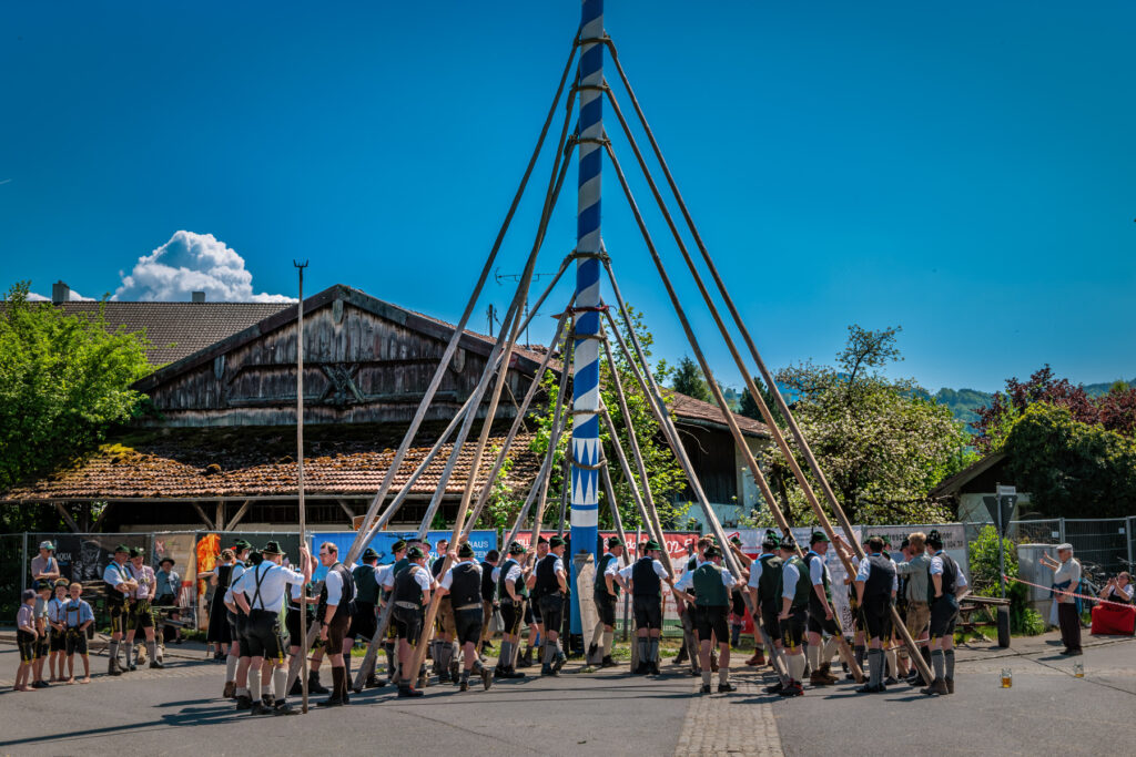 Das Aufstellen selbst war ein Höhepunkt bayerischer Festkultur: Mit vereinten Kräften und reiner Muskelkraft wurde der Maibaum mit traditionellen „Schwaiberln“ in die Senkrechte gehievt – zentimeterweise, unter klaren Kommandos, mit viel Geschick und noch mehr Schweiß. Dabei kam selbstverständlich kein Kran zum Einsatz – der Baum wurde „richtig echt“ aufgestellt. Die abschließende Verschraubung übernahm ein eingespieltes Team mit schwerem Gerät und routiniertem Blick.