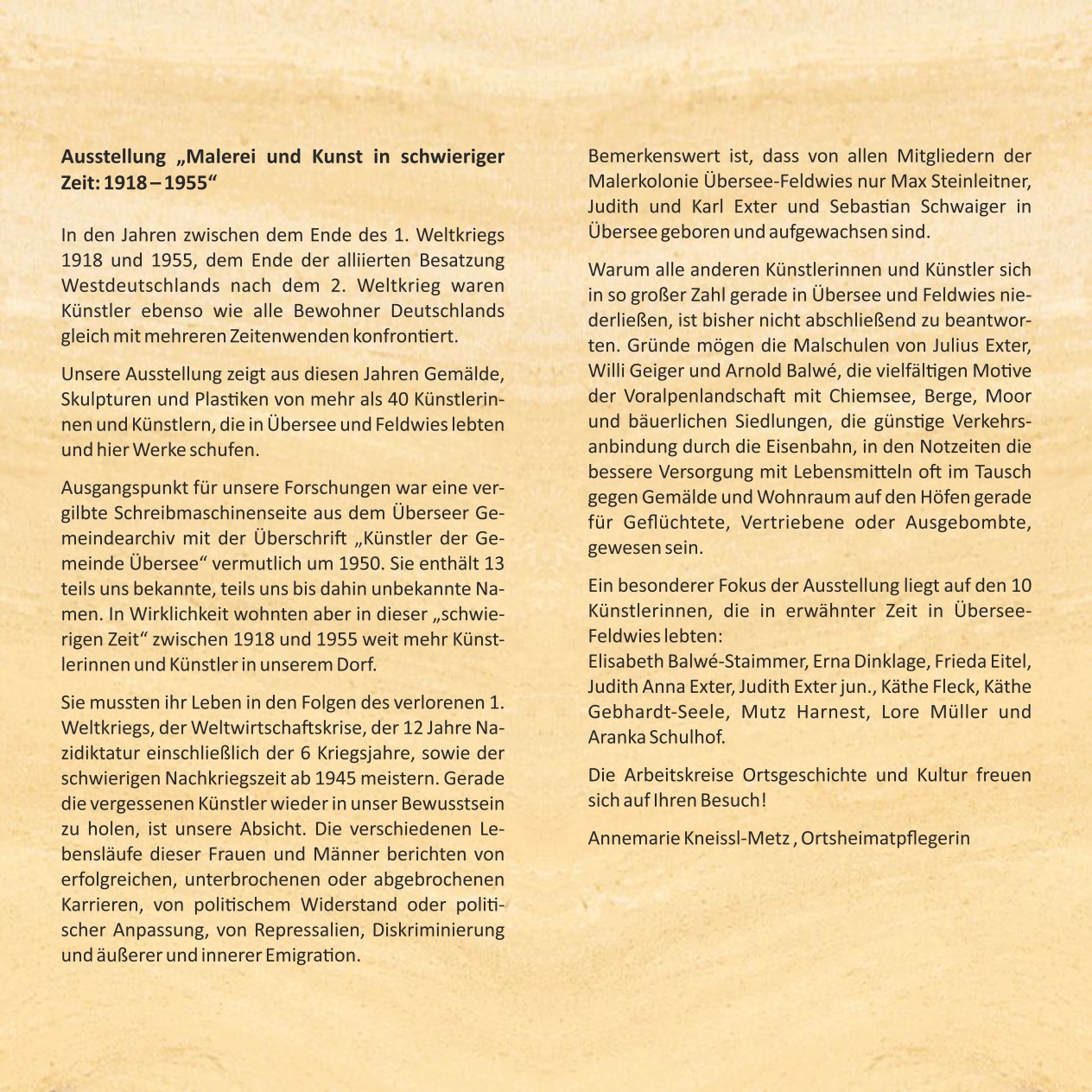 Gesprächsrunden und Lesungen werden das Leben einzelner Künstlerpersönlichkeiten besonders beleuchten: Donnerstag, 13.4. um 18 Uhr erzählt Enkel Stephan Harnest vom Leben und Werken seiner Großeltern, am Samstag, den 15.4. um 18.00 Uhr erinnert Julia Geiger und Martin Metz mit einer Lesung aus den Lebenserinnerungen von Willi Geiger, am Dienstag, den 18.4. um 18 Uhr beleuchtet Carsten Lewerentz das Schaffen von Karl Meisenbach und Käthe Seele und am Samstag, den 22.4. um 18 Uhr gedenkt man Walter Lederer und Walter Brendel, die heuer 100 Jahre alt geworden wären. Mit dabei sind Sophie Lederer als Ehefrau Lederers und Michaela Haslberger als Tochter Brendels.