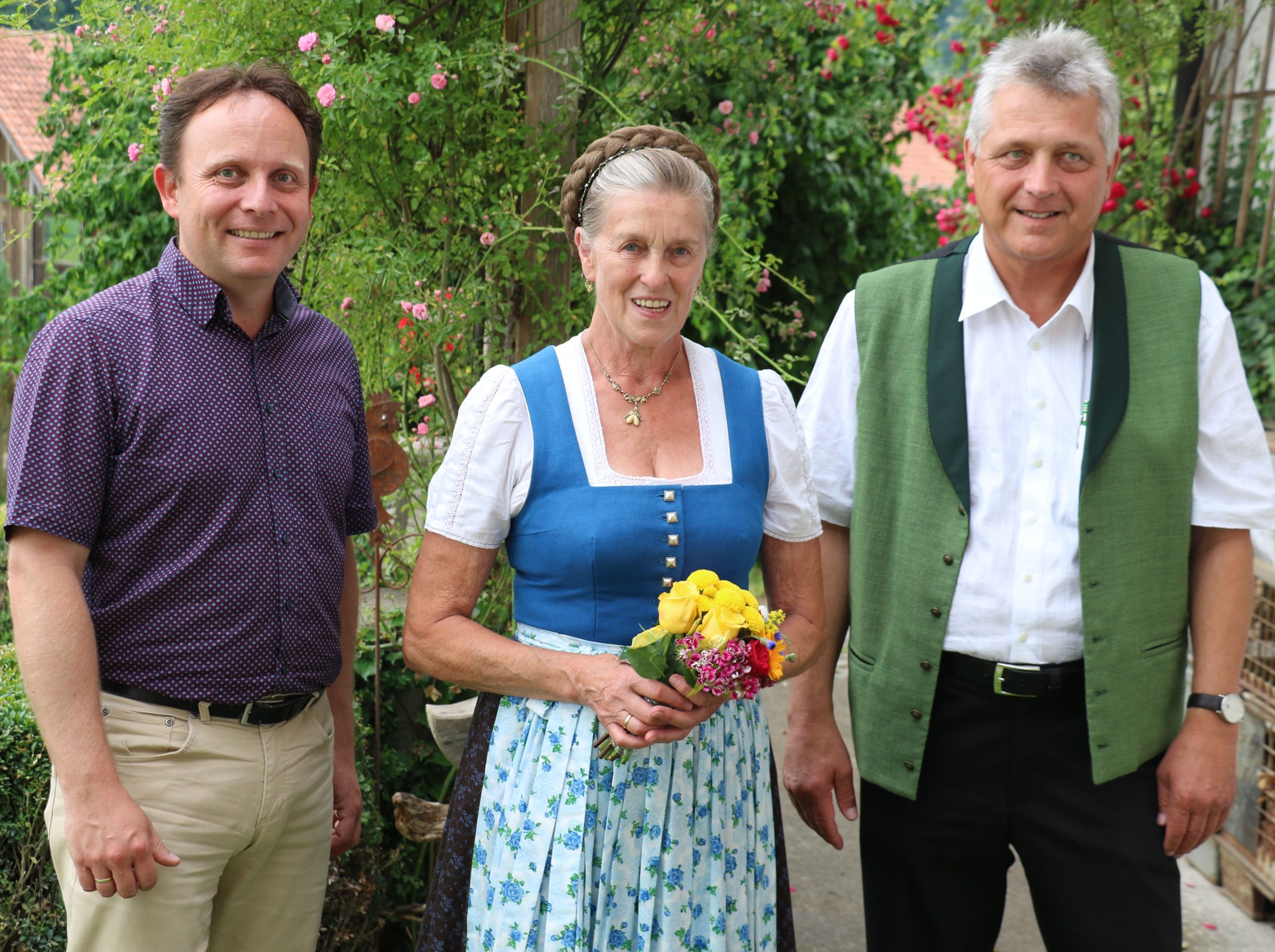 Altbürgermeisterin Marianne Steindlmüller feierte ihren 70. Geburtstag und die Schar der Gratulanten war unüberschaubar. Bürgermeister Daniel Mair (links) überbrachte die Glückwünsche der Gemeinde Frasdorf, für die sie seit 1990 verantwortlich tätig war. Der Sprecher der Bürgermeister im Landkreis Rosenheim Bernd Fessler, (rechts)brachte die guten Wünsche der 46 Bürgermeister. Marianne Steindlmüller gehörte dem Gremium zwölf Jahre an.