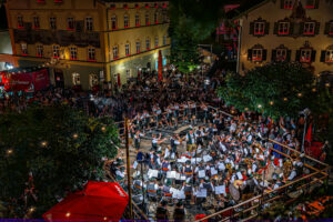 Im Schein der Scheinwerfer und begleitet von der Musikkapelle Neubeuern zeigen die Plattler des Trachtenvereins Neubeuern den kraftvollen Holzhacker-Tanz – ein Höhepunkt der Marktbeleuchtung, bei dem Musik, Brauchtum und Bühnenenergie zu einem unvergesslichen Erlebnis verschmelzen.