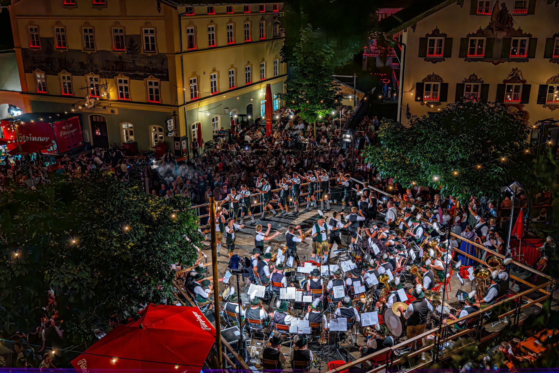 Im Schein der Scheinwerfer und begleitet von der Musikkapelle Neubeuern zeigen die Plattler des Trachtenvereins Neubeuern den kraftvollen Holzhacker-Tanz – ein Höhepunkt der Marktbeleuchtung, bei dem Musik, Brauchtum und Bühnenenergie zu einem unvergesslichen Erlebnis verschmelzen.