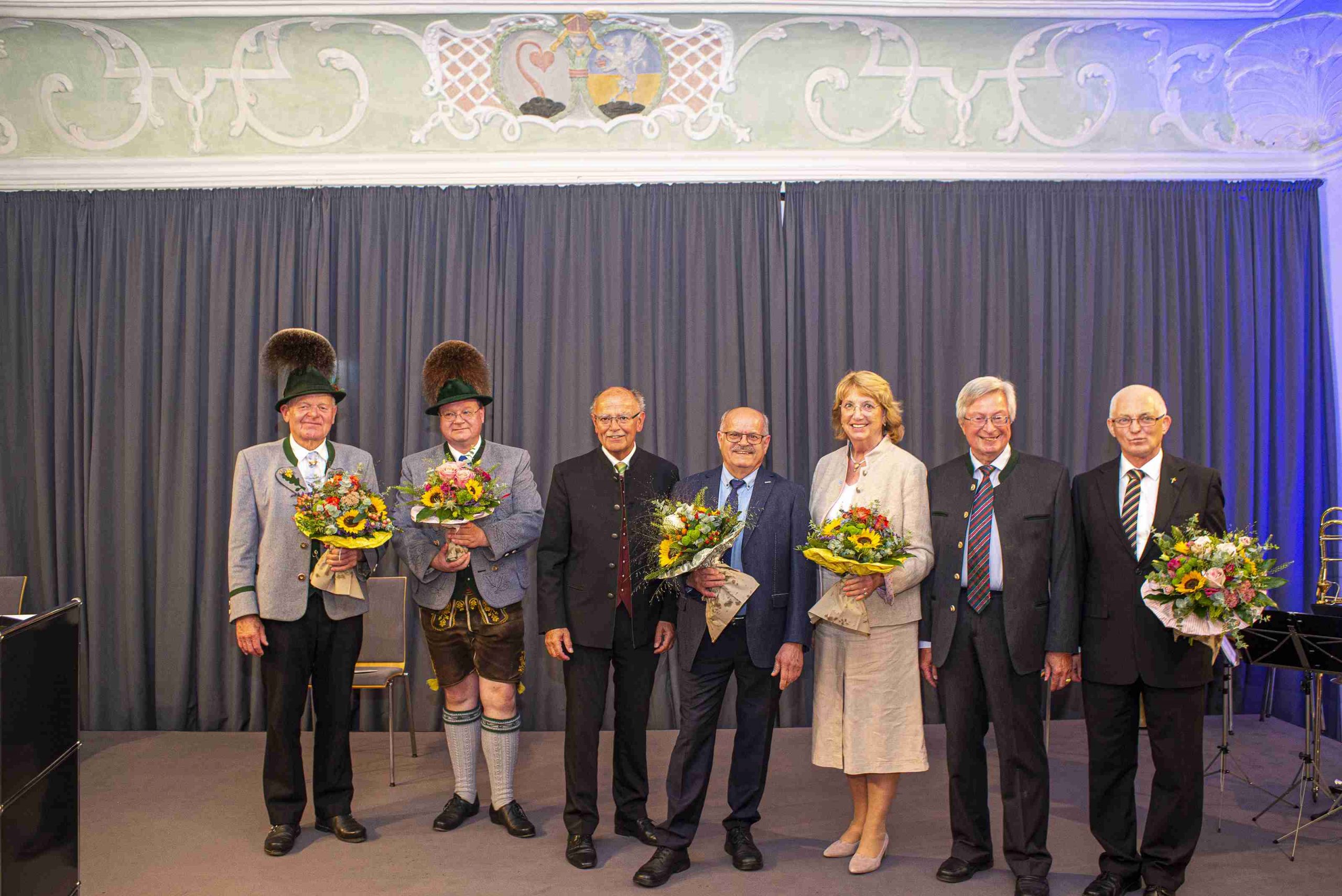 Alle Geehrten, die im Kloster Seeon vom Bezirk Oberbayern ausgezeichnet wurden, v.l.: Peter Eicher, Markus Kronberger, Präsident Josef Mederer, Chris Wunder, Annelies und Dr. Michael Mücke und Georg Wimmer.