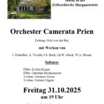 Am Freitag, 31. Oktober findet in der Evangelischen Erlöserkirche, Loitshauserstr. 14 um 19 Uhr ein Konzert statt. Das Orchester Camerata Prien unter Leitung von Götz von der Bey spielt Werke von J. Pachelbel, A. Vivaldi, J.S. Bach, Ch.W. Gluck und W.A. Mozart.