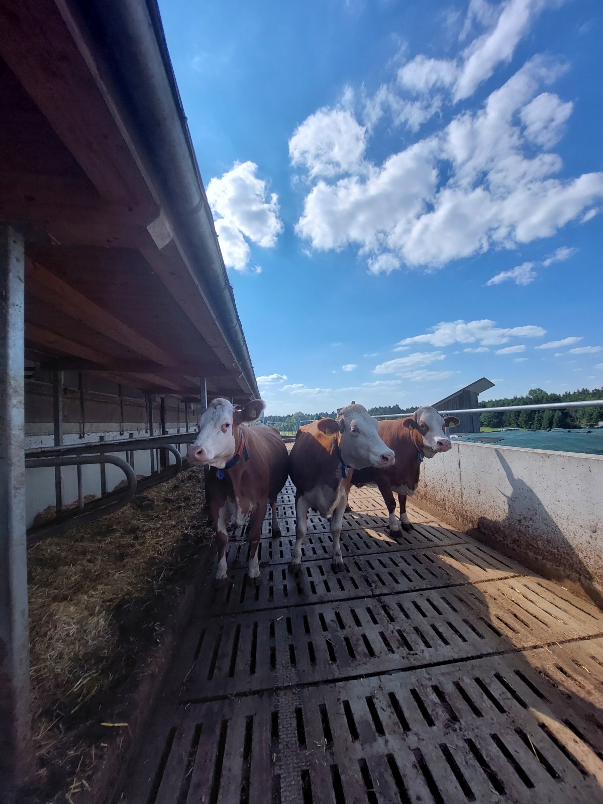 Fleckviehkühe im Laufhof unter freiem Himmel. Links daneben die Liegeboxen der Kühe mit Stroh. Hier genießen die Tiere das Freiluftklima.