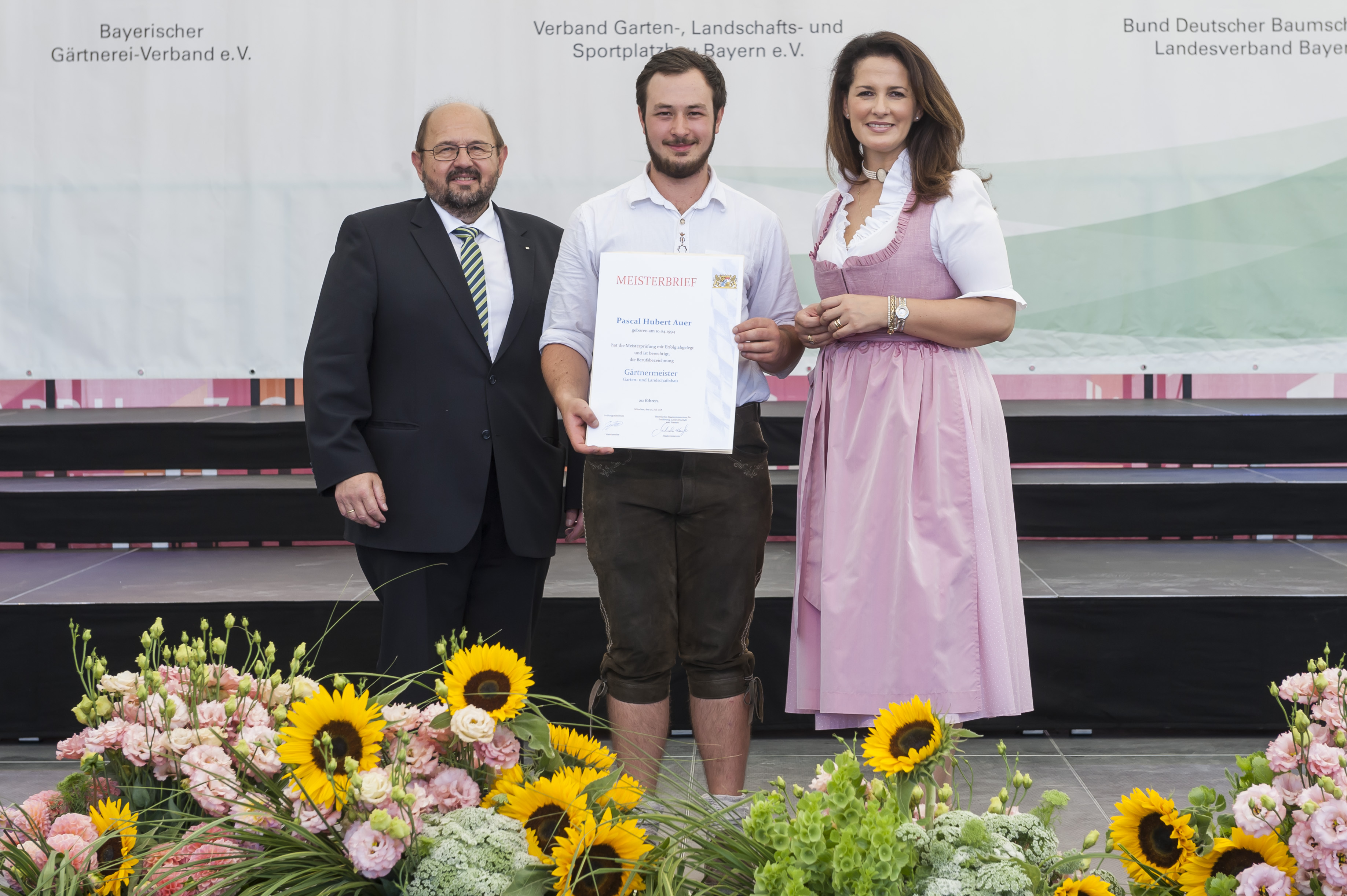 v.l.: Gerhard Zäh, Präsident des Verbandes Garten-, Landschafts- und Sportplatzbau Bayern; Pascal Auer, Schnaitsee, Garten- und Landschaftsbau; Staatsministerin Michaela Kaniber