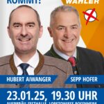 Genau einen Monat vor der Bundestagswahl kommt der erste prominente Politiker, der stellv. Ministerpräsident und Wirtschaftsminister Huber Aiwanger am kommenden Donnerstag, 23.Januar nach Rosenheim.