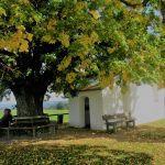 Der Kapellenweg zwischen Parnsberg und Söllhuben führt über ein wunderschönes Hochplateau mit phantastischen Ausblicken in die Berge.  Bei der Parnsberger Kapelle, einem wunderbaren Ort, lädt eine Bank zum Ausruhen und Schauen ein – ein absolutes Muss! Dann fahren wir weiter zur Kapelle “Zur Schnerzhaften Muttergottes” oberhalb Söllhuben, einem kulturellen Highlight, das wir auch besichtigen. Dann gehts weiter auf der wenig befahrenen Kreistraße bis Wurmsberg und abwechselnd auf Feldwegen und Asphaltstraßen über Ofenwinkl nach Mangolding. Hinter Mangolding überqueren wir die Kreistraße Prien – Riedering und kommen nach Kinten. Jetzt haben wir noch einmal eine kurze schlechte Wegstrecke hinunter bis Oberachthal , auf der so mancher Radler sein Drahtross lieber schiebt.  Aber ein Witzvogel hat ein Verkehrschild aufgestellt, daß Radler auf Tempo 5 km herunterbremsen soll.