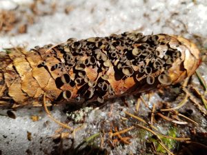 Deutlich häufiger und in diesem Jahr an vielen Stellen zwischen Arfenreuth bei Grafenau und Zwiesel leicht zu finden sind die schwarzen Fichtenzapfen-Becherlinge (Rutstroemia bulgarioides). Sie benötigen bodenfeuchte Senken oder schneereiche montane Lagen. „Auf Fichtenzapfen wachsen auch die ersten echten Speisepilze des Jahres, die Fichtenzapfenrüblinge (Strobilurus esculentus).“ Sie kommen oft zu Tausenden in Fichtenbeständen empor und können zu einer ersten feinen Pilzmahlzeit werden, wenn man ihren ungenießbaren Doppelgänger, den Fichtenzapfen-Helmling kennt und beachtet.