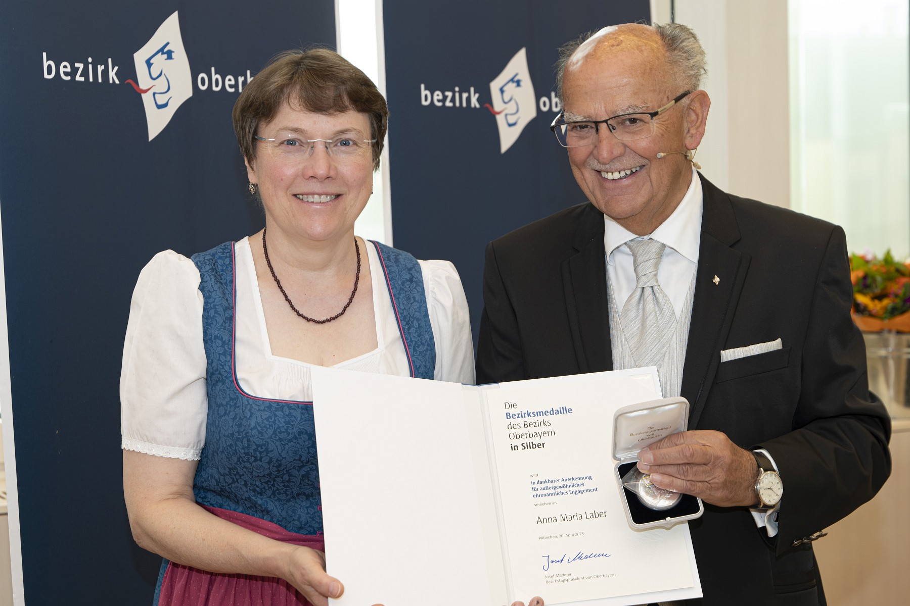 Verleihung der Bezirksmedaille: Bezirkstagspräsident Josef Mederer (rechts) ehrt Anna Maria Laber.