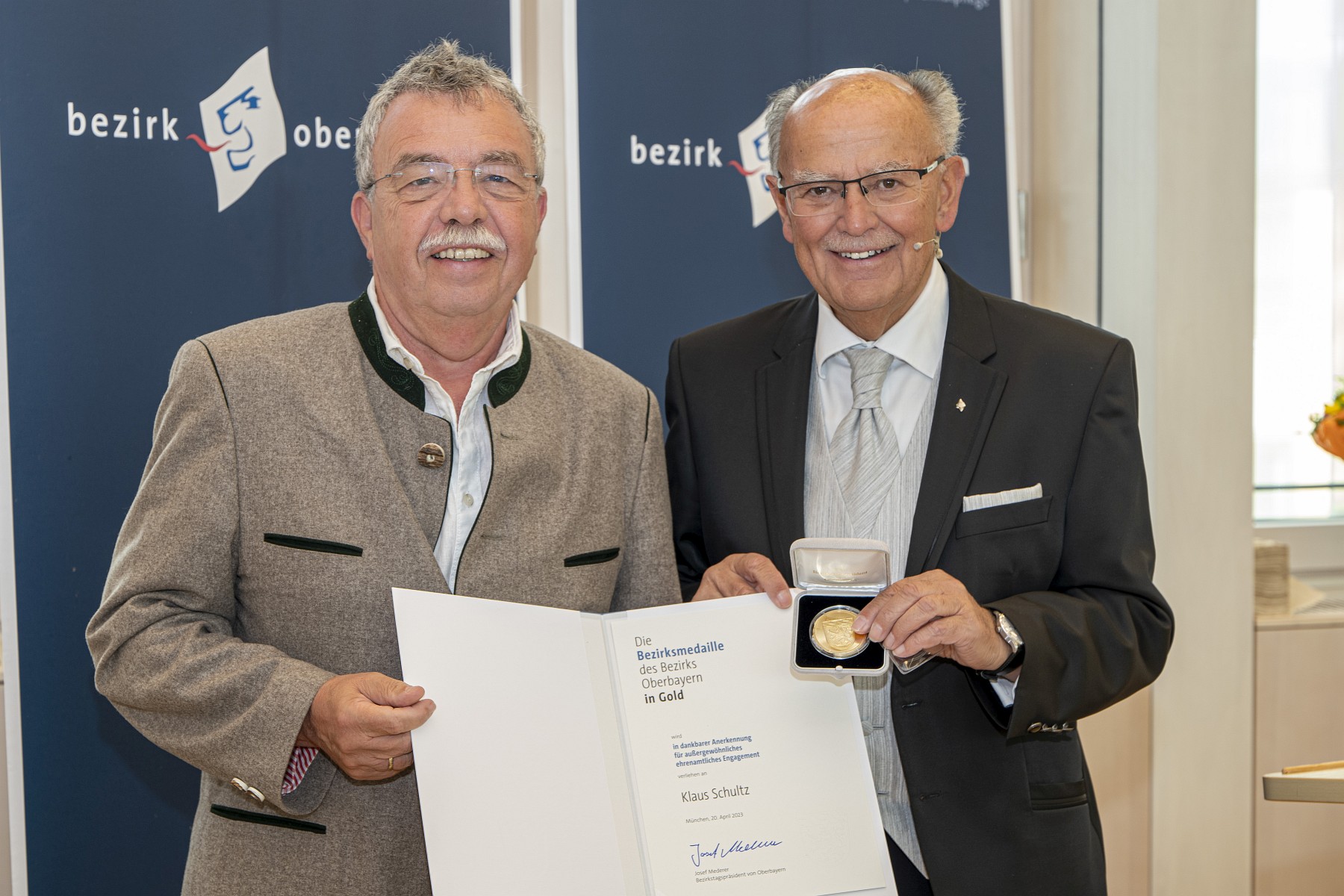 Verleihung der Bezirksmedaille: Bezirkstagspräsident Josef Mederer (rechts) ehrt Klaus Schultz