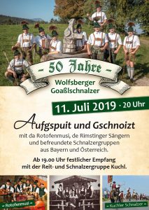Die Wolfsberger Goaßlschnalzer feiern im Rahmen der heute beginnenden Festwoche des Trachtenvereins Heutau am morgigen Donnerstag, den 11. Juli, ab 20 Uhr ihr 50-jähriges Bestehen. Mit dabei sind neben befreundeten Schnalzergruppen aus Bayern und Österreich die Musikgruppe Rotofenmusi und die Rimstinger Sänger. Bereits ab 19 Uhr findet der festliche Empfang mit der Reit- und Schnalzergruppe Kuchl statt.