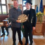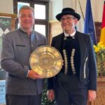 Bildunterschrift: Der Bayerische Staatsminister Christian Bernreiter zeichnet Siegfried Bradl mit dem von Minister Söder gewidmeten „Bayerischen Poetenteller“ aus (v.li.).