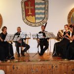 Für das letzte Stück des Abends holte sich das Holzbläserquintett ihren Arbeitskollegen Albert Osterhammer mit seiner Bassklarinette zum gemeinsamen Spiel auf die Bühne. Zusammen mit dem Lokalmatador und musikalischen Leiter der Konzertreihe spielten sie als Bläsersextett „Mladi – Die Jugend“ von Leos Janacek (1854-1928). Der Komponist schildert in einer teils wehmütigen, teils heiteren Autobiographie in Tönen seine Jugend im Mähren des mittleren 19. Jahrhunderts. Mit großer Präzision, differenzierter Artikulation und Spielfreude kommunizierten die sechs Musiker mit viel Kontakt zueinander. Für den nun folgenden lang anhaltenden Beifall bedankten sich die Musiker mit „I Got Rhythm“, einem Jazztitel aus dem Musical Girl Crazy von George Gershwin (1898-1937).