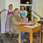 „Volksmusik ist in. Lass mas klinga!“, so Karl-Heinz Reimeier, der Moderator des Abends. Mit abwechslungsreichen Beiträgen über Land und Leute führte er durchs Programm. An der Gitarre brachte er gar den ganzen Saal zum Singen, denn nach kurzer Anleitung stimmten alle in „Steig affi am Berg“ und in eine klangvolle Arie ein. Schmunzler beim Publikum erzeugten seine Umkehrverse („I erzähl da a Marl vom Drill und vom Drall“), Karten-Auszählverse und entführte ins Reich der Volksdichtung und Volksreime („Reserl, Broutbreserl, kihr’s Nudelbrett o, ham d‘Henna draaf bledert, ham d’Nul erst an Gschmo“). In Erinnerung an den kürzlich verstorbenen Heimatpflegerkollegen Josef Fendl gab Reimeier einige von dessen Bauernseufzer zum Besten. „Wer einen anderen Menschen zum Lachen bringt, erlöst eine arme Seele aus dem Fegfeuer“, so kündet ein alter Volksglaube. An diesem Abend dürften es viele gewesen sein.