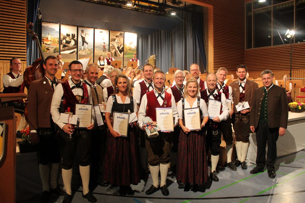 Geehrt wurden auch langjährige Musikanten: Josef Hieber (Saxofon) erhielt die Ehrennadel des bayerischen Blasmusikverbandes für 55 Jahre als aktiver Musiker, außerdem ist er schon viele Jahre als Vorstand des Musikfördervereins tätig. Die Ehrennadel für 50 Jahre aktives Musizieren erhielten Otto Untermarzoner (Saxofon), Anton Maurer (Flügelhorn) und Michael Stuffer (Flügelhorn). Auch sie haben, genauso wie Josef Hieber, schon unzählige Stunden bei Proben und Auftritten verbracht. Die Ehrennadel für 25 Jahre aktives Musizieren wurde Martin Weyerer (Tube), Thomas Stadler (Tuba), Martina Moser (Waldhorn) und Ägidius Moser (Tenorhorn) verliehen. Des Weiteren wurden mit Dank und Anerkennung die Marketenderinnen Magdalena Weyerer und Angelika Heibler verabschiedet.