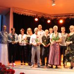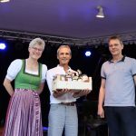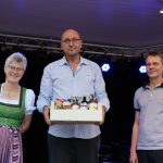 Aus den Reihen der 25 Lehrkräfte wurden im Verlaufe des Konzertes zwei Lehrer für ihre jahrzehntelange Zugehörigkeit zur Musikschule Prien geehrt: Götz von der Bey unterrichtet seit über 30 Jahren Klavier und Cello. Manfred Mokros ist sage und schreibe seit über 40 Jahren Lehrer für E-Gitarre, Gitarre, E-Baß und Querflöte. Brigitte Buckl und Tilo Heinrich bedankten sich mit Präsentkörben für die Treue der beiden Lehrer.