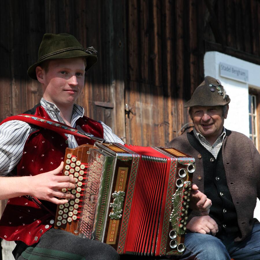 Musikanten sitzen auf der Bank für den Stadel Bergham © Bezirk Oberbayern, Archiv Freilichtmuseum Amerang.