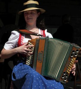 Ein typisches Instrument der alpenländischen Musik: die steirische Harmonika. Ihre charakteristischen Bässe und der Gleichton verleihen ihr einen einzigartigen Klang. © Bezirk Oberbayern, Archiv Freilichtmuseum Amerang, Aufnahme: Gerhard Nixdorf.