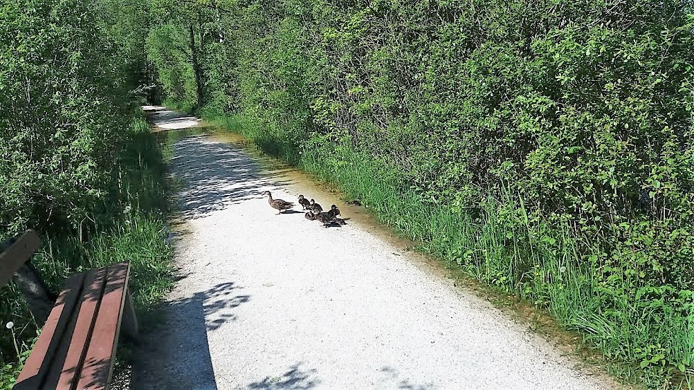 Enten überqueren den Uferweg