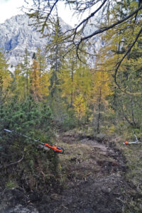 Die neue Trassierung folgt einem alten Jägersteig und umgeht den Felssturzbereich im so genannten „Banngraben“ in südlicher Richtung. Damit der neue Steig den Anforderungen an mehrere tausend Begehungen pro Jahr in beiden Richtungen erfüllt, wird der Jägersteig aktuell ertüchtigt. Die Waldarbeiter vom Revier Au-Schapbach haben bis zu den ersten Schneefällen intensiv an der Neutrassierung des Steiges gearbeitet: „Wir haben rund 250 Meter im unteren Teil bereits fertig gestellt. Im oberen Teil trifft der Steig direkt nach dem Banngraben wieder auf den bestehenden Wanderweg Richtung Trischübel. In diesem Abschnitt müssen Wanderer künftig eine rund zehn Meter hohe Geländekante überwinden. Hier haben wir bereits 30 Meter Stahlseil und mehrere Eisenbügel eingebaut“, erklärt Revierleiter Martin Weckel und ergänzt: „Damit ist klar: Der neue Steig wird eine höhere Schwierigkeit haben als der alte. Er ist deutlich steiler, es besteht Absturzgefahr und auch mit Steinschlag ist zu rechnen. Eine einfachere Wegführung ist in diesem dynamischen, hochalpinen Gelände leider nicht möglich.“